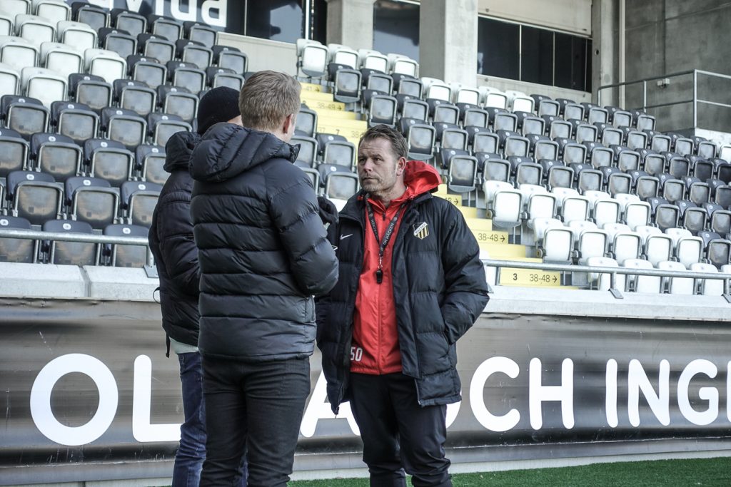 Här intervjuas Mikael Stahre av journalisterna Linus Petersson från Fotbollskanalen och Mattias Balkander från Göteborgs-Posten.